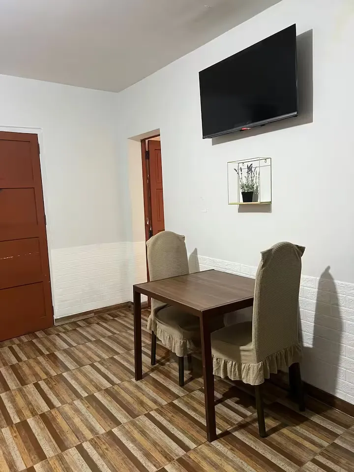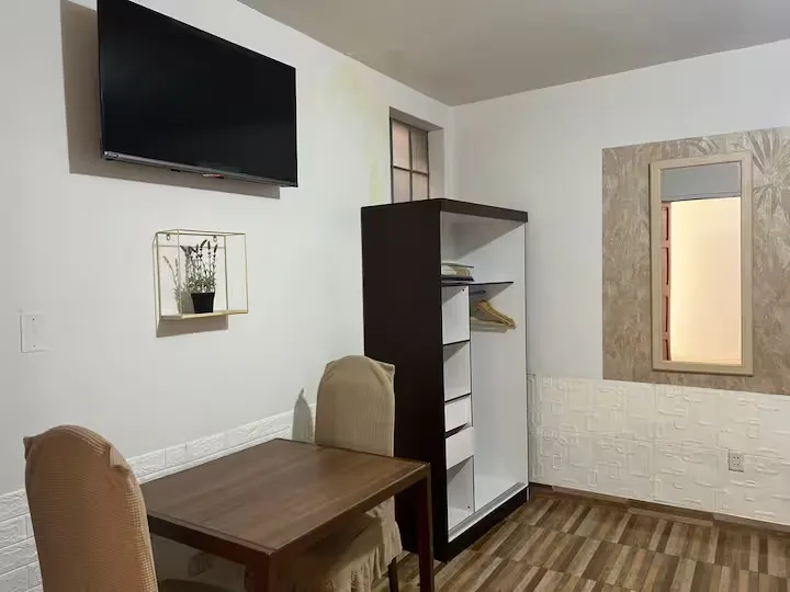 Nuestro espacio cuenta con dos camas, TV con cable, standard y SMART (no otorgamos cuentas), mesa, sillas, velador con lámpara y amplio ropero, además tiene un espacio externo para tomar sol o fumar.